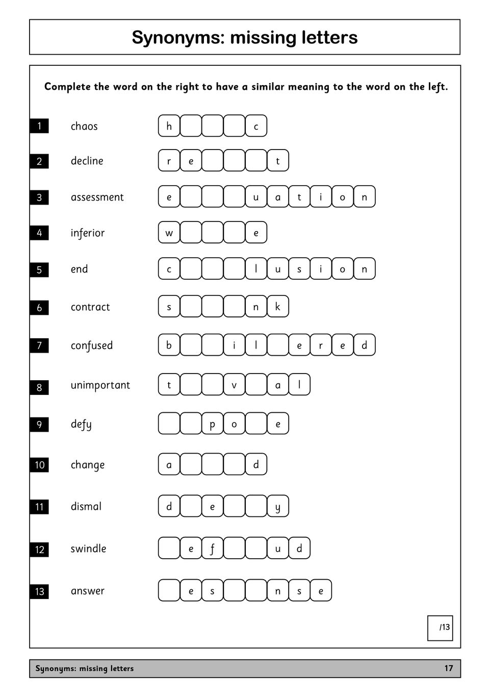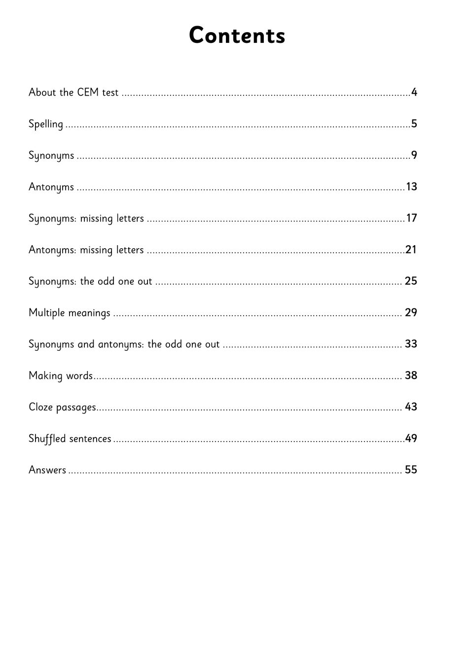 - Authentic CEM-style practice covering synonyms, antonyms, spelling, cloze, vocabulary and more