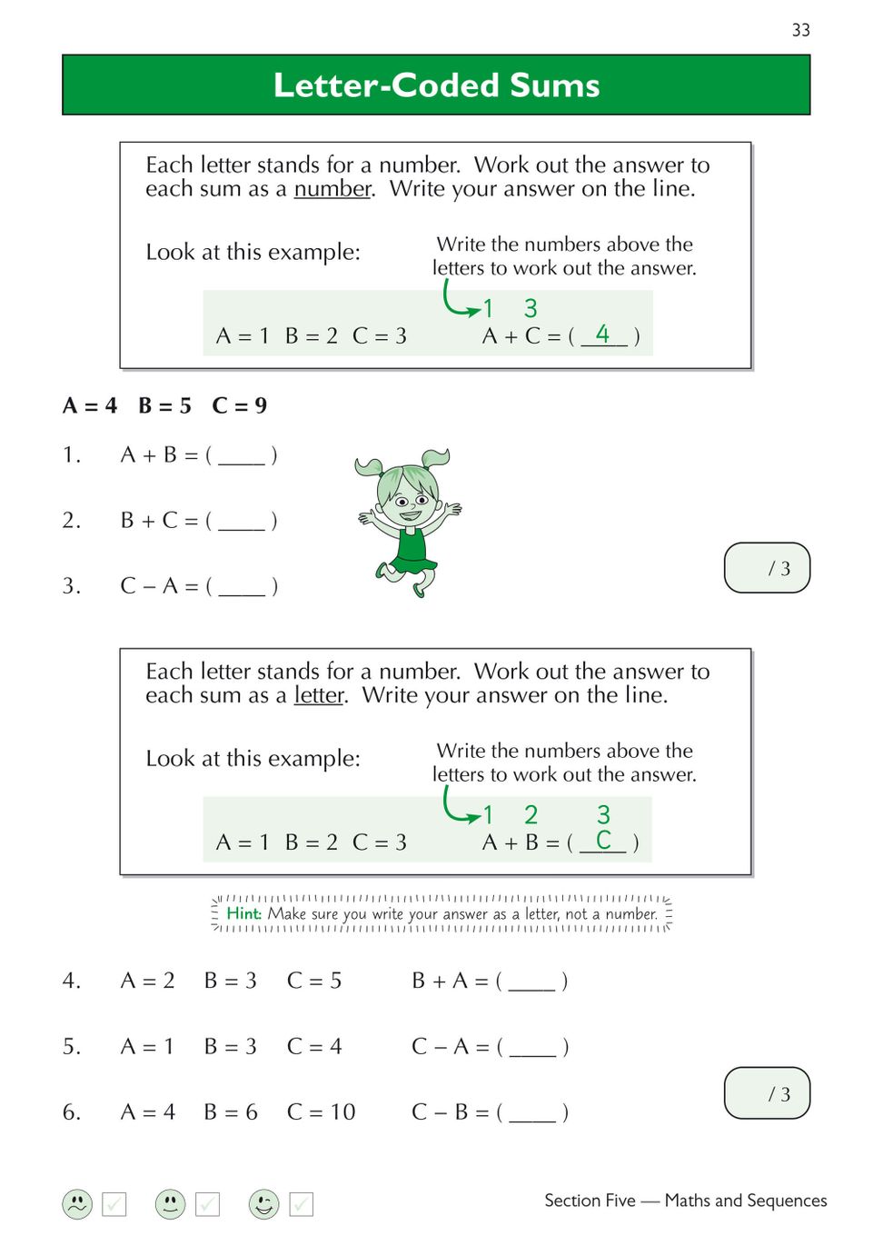 Sample Verbal Reasoning page featuring letter-coded sums, complete with clear instructions and friendly hints to guide young learners through each concept.