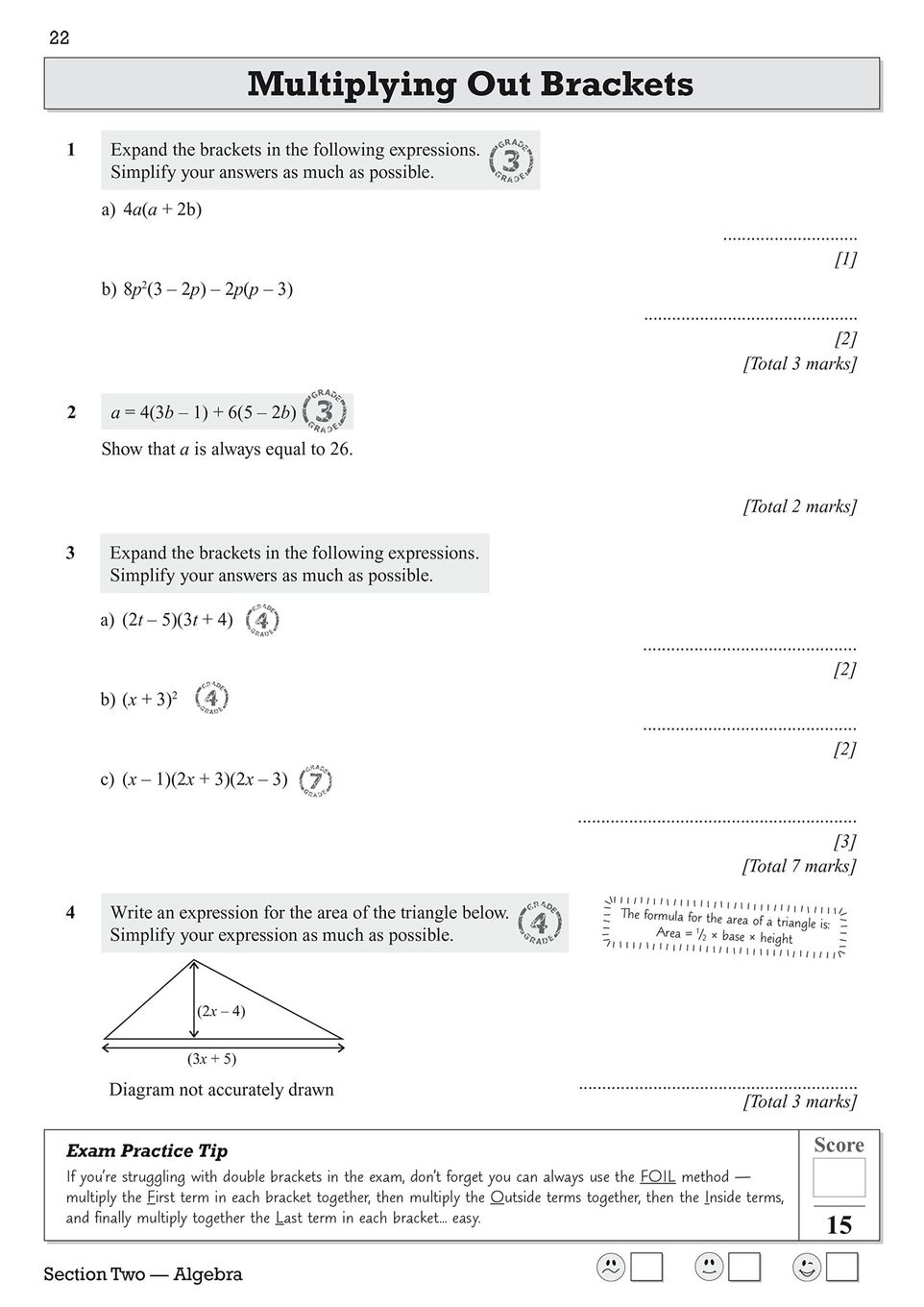 This workbook brings together algebra, geometry, statistics, ratio and proportion under one cover, with clear difficulty indicators stamped on each question so your child knows where to aim their effort. Full step-by-step solutions are included at the back, which means they can check their method as well as their final answer—an essential for independent revision. The book also includes two complete practice papers, giving your teenager a realistic timed run-through before the real thing. Whether they're consolidating classroom learning or catching up at home, the structured approach keeps revision on track without guesswork.