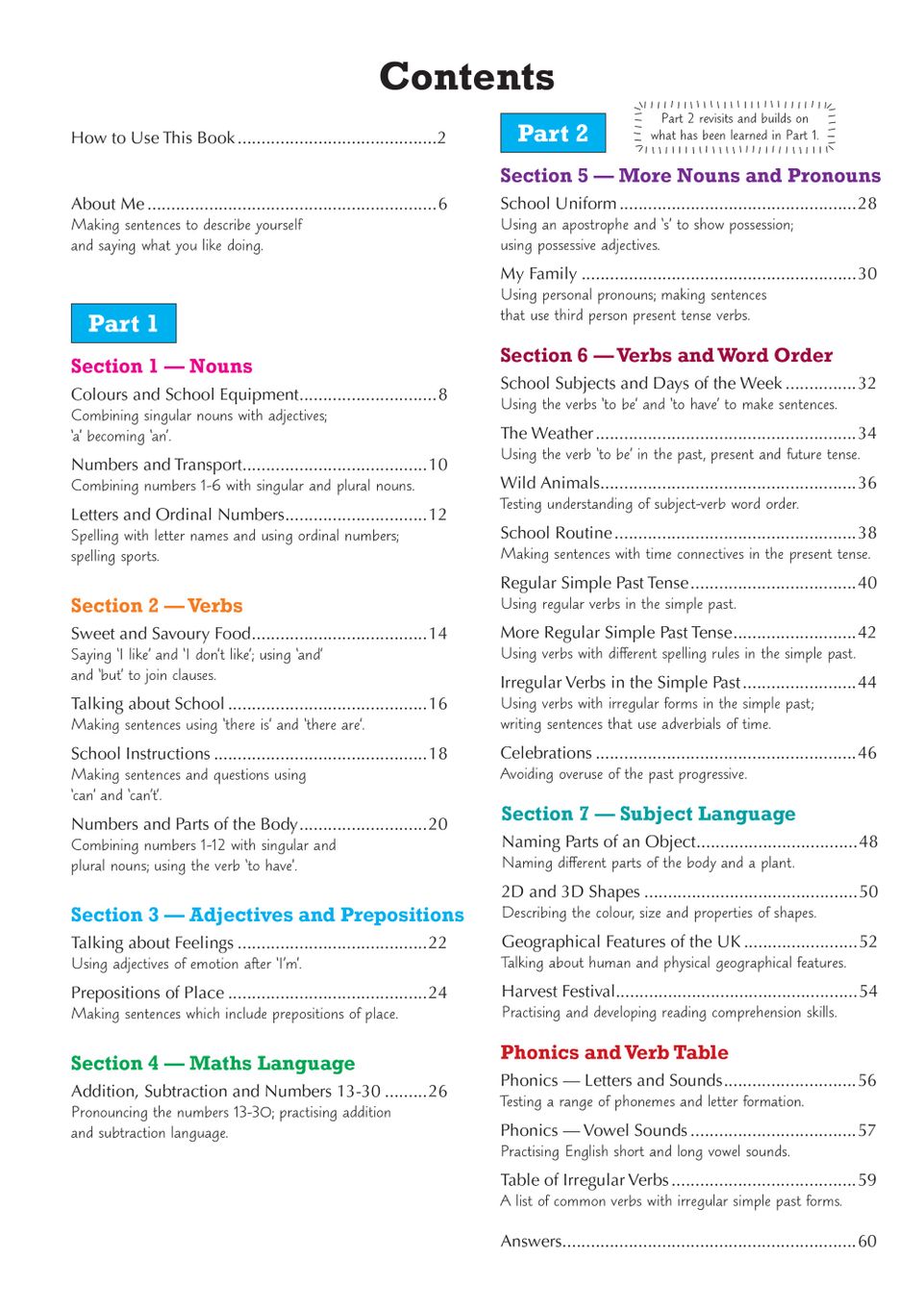 Finally, the English as an Additional Language (EAL) for Ages 11-16 - Workbook 1 (to English) is also very useful for children studying outside of the UK on comparable international curriculums such as the Cambridge Primary Curriculum or The Pearson Edexcel International Primary Curriculum.