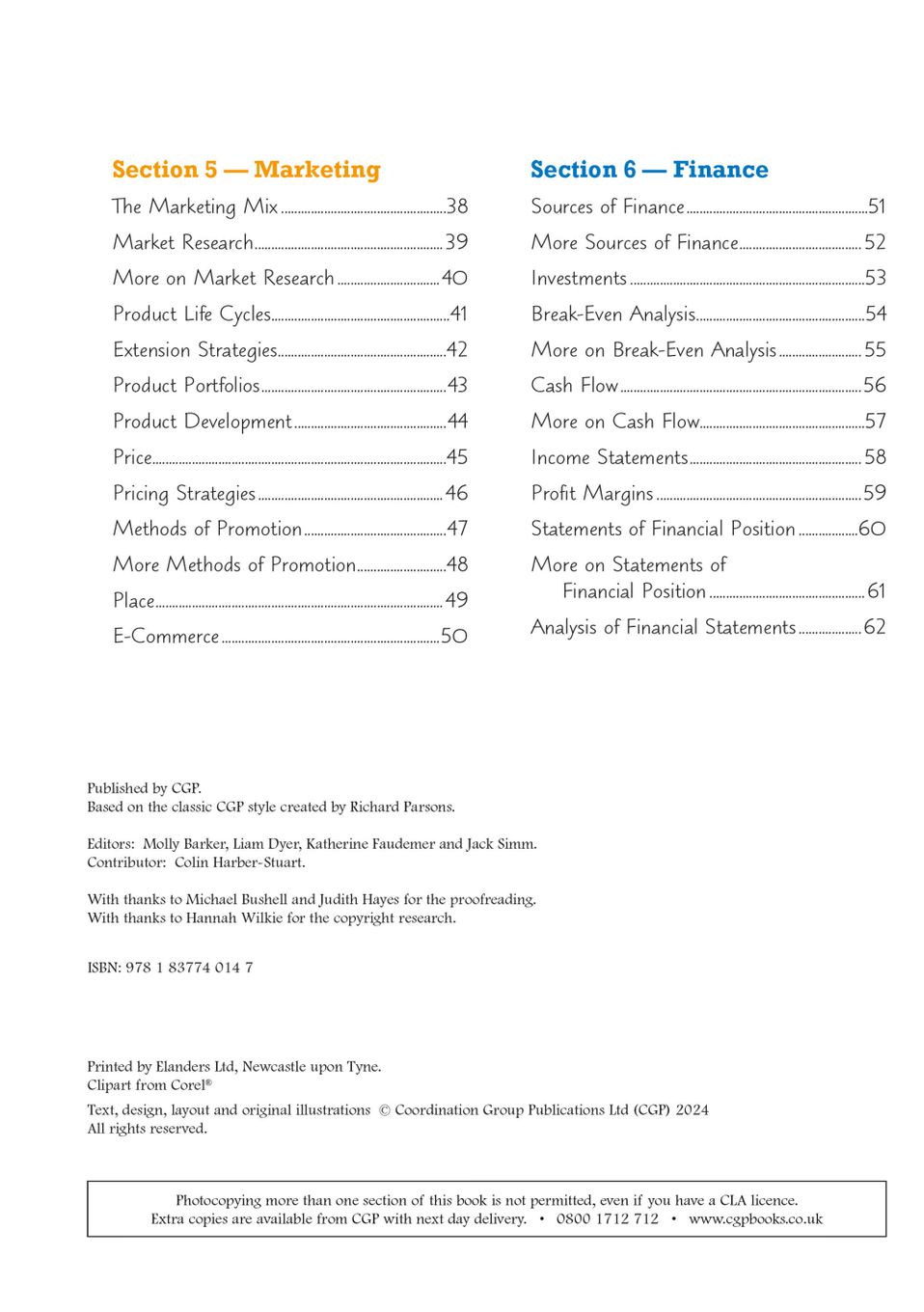 Every topic is broken down into snappy explanations, supported by diagrams, graphics and real examples that make abstract concepts like sources of finance, break-even analysis and market research easier to understand and remember. CGP's signature style keeps the tone light without diluting the rigour, so your child can work through marketing strategies, cash flow or financial statements without feeling overwhelmed. The layout is clean and logical, perfect for last-minute topic checks or building a solid foundation as they progress through the course.