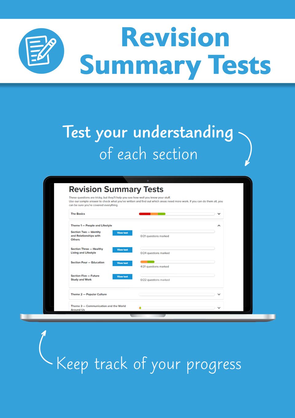 - Includes access to CGP RevisionHub with quick quizzes, personalised mistakes quiz, revision summary tests, listening tracks and native-speaker audio
