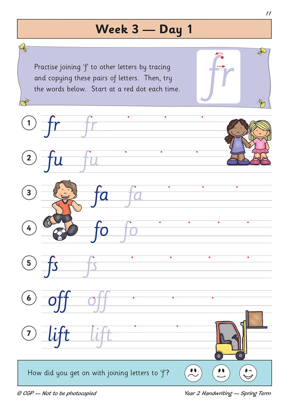 Every page features example words drawn with arrows, showing your child exactly how to form and join letters step by step. Fun illustrations and clear instructions keep practice sessions short and stress-free, while the week-by-week layout makes it easy to slot handwriting into homework or morning routines. You'll find words, phrases, and joined-up writing drills that align with the Year 2 English National Curriculum, so every session supports classroom learning and prepares your child for KS1 expectations.