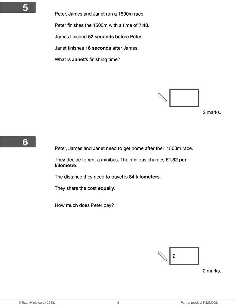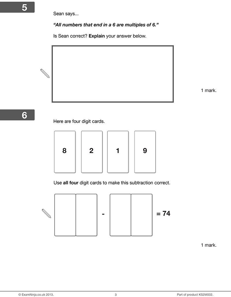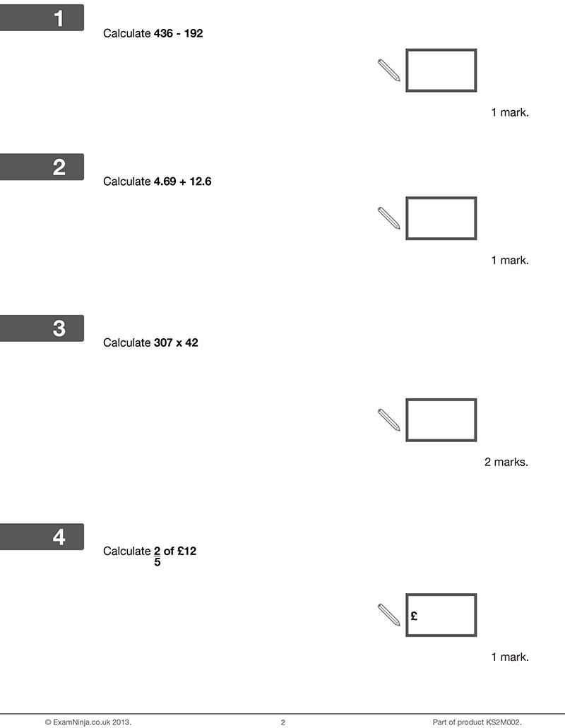 - Non-calculator questions covering fractions, decimals, ratio, mental arithmetic, and problem solving
