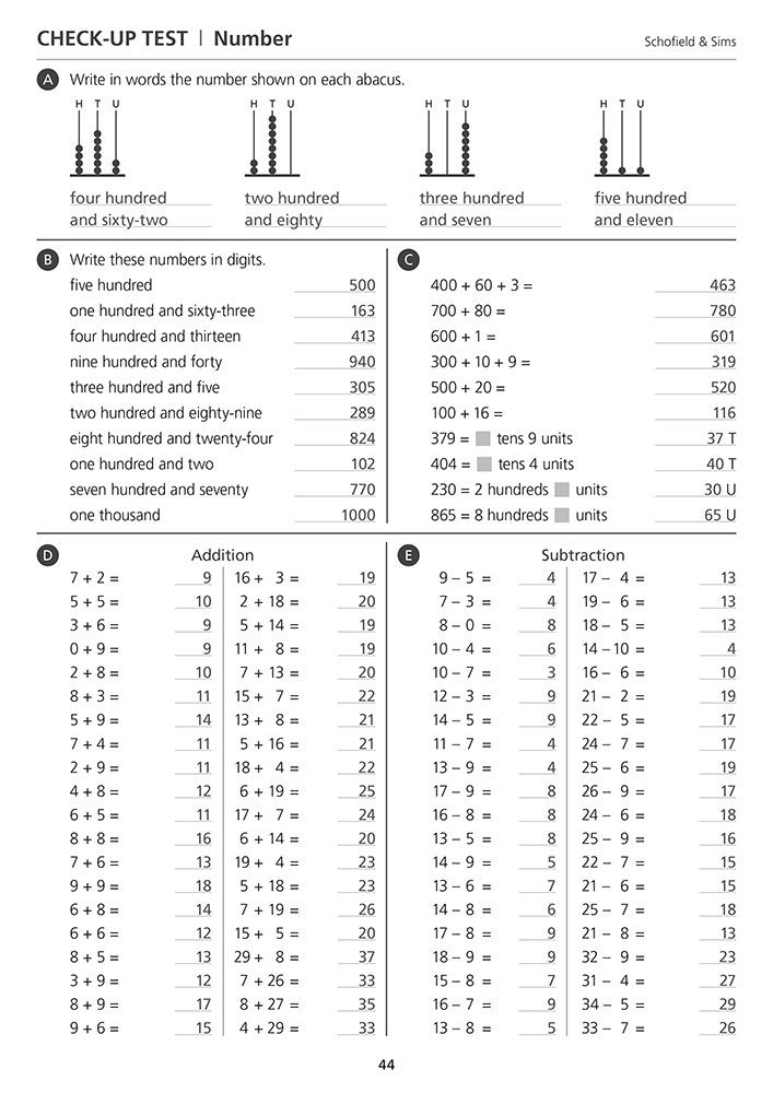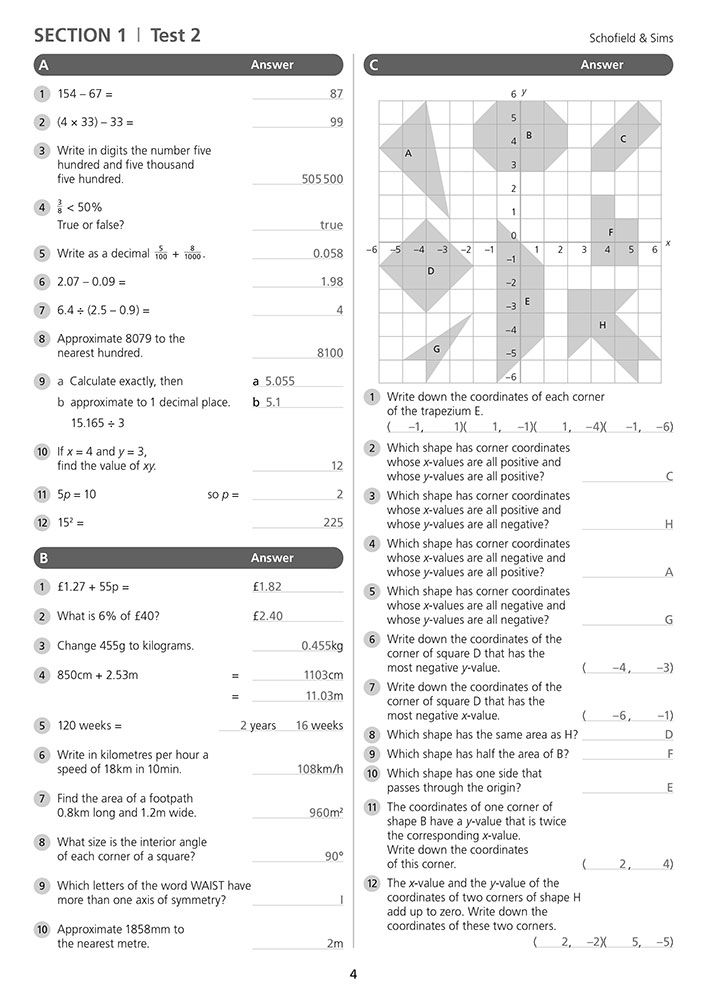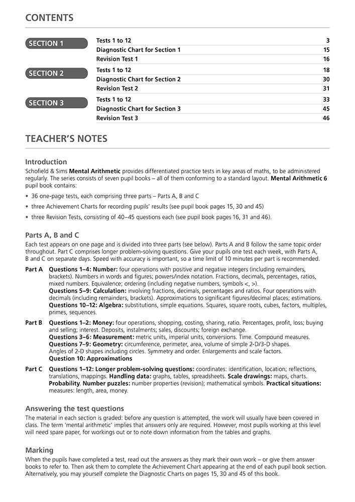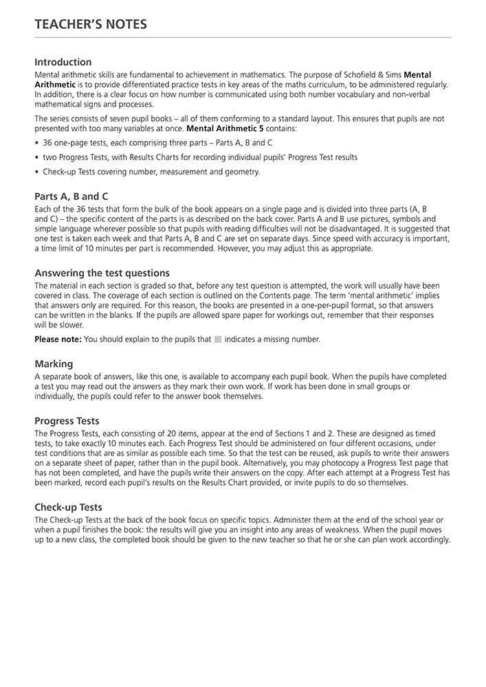 Each of the six pupil books contains 36 one-page tests split into three parts: minimal-language questions to practise core skills, questions using number vocabulary, and word problems that stretch reasoning. Topics progress from place value, fractions, and telling the time in Book 1 to advanced concepts like algebra, ratio, and spreadsheets in Book 6. Every book is matched by its own answer book, making marking fast and accurate. The Teacher's Guide includes two entry tests to help you choose the right starting point for your child, diagnostic checks for each book, and photocopiable resources such as number lines and multiplication squares. Free downloads and online answers are also available from the Schofield & Sims website.