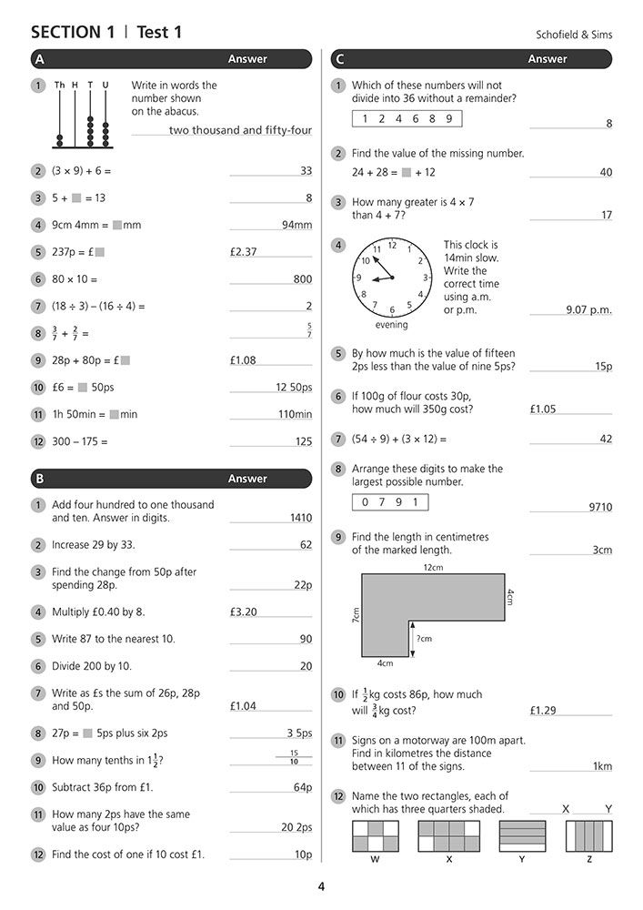 - 36 one-page tests per book, each split into minimal-language questions, vocabulary-based tasks, and word problems to build speed and reasoning