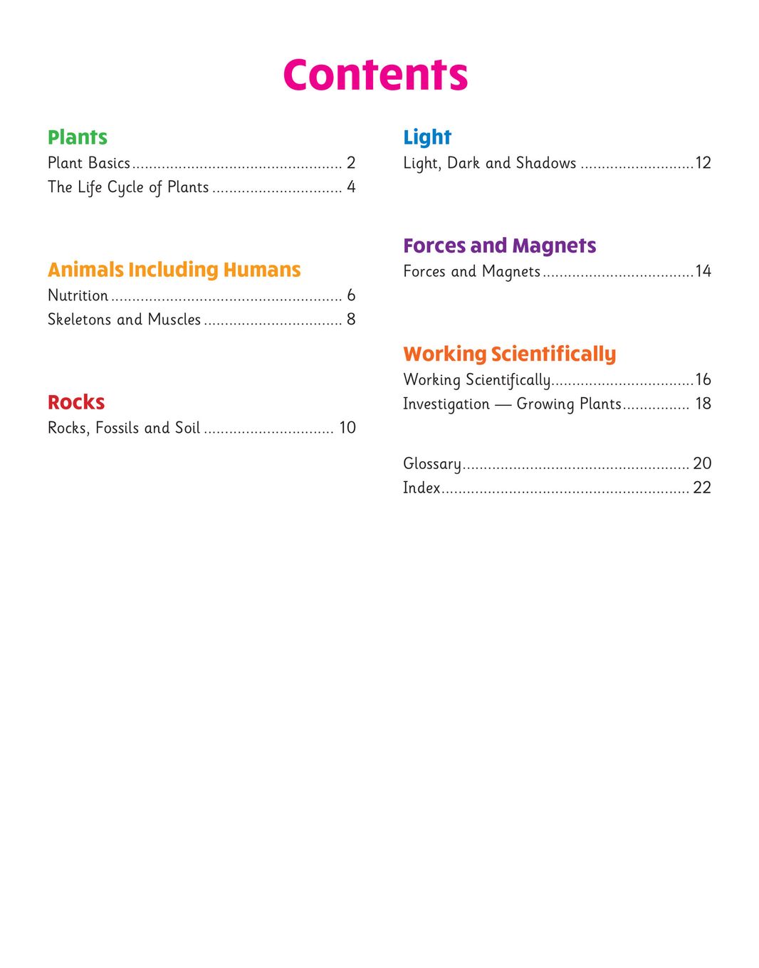 - Full-colour spreads covering plants, animals, rocks, light, forces and magnets with only essential facts