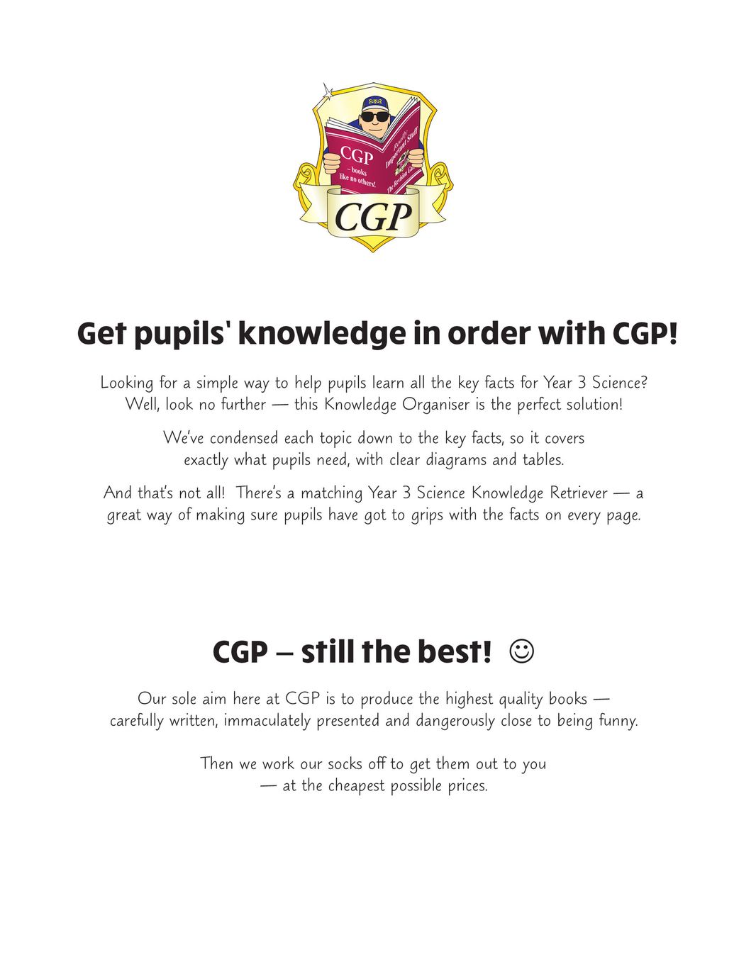 The KS2 Science Year 3 Knowledge Organiser gives your 7–8 year old everything they need to master the essential science facts for their school year. Published by CGP, this full-colour revision guide strips each topic down to the core information your child must learn, covering Biology, Chemistry and Physics in clear, visual spreads. Whether they're revising at home or reinforcing lessons, this book puts the right facts at their fingertips without overwhelming detail, so they build confidence and secure knowledge that will carry them through to Key Stage 2 SATs.