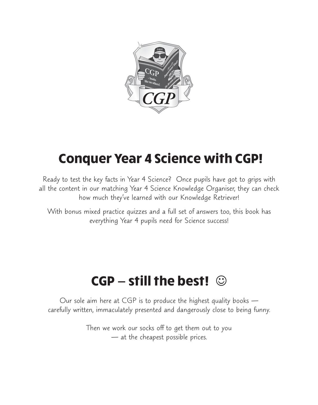 CGP pairs this retriever with their Year 4 Science Knowledge Organiser, so your child revises from the organiser then tests themselves here by recalling key facts and vocabulary. Full answers sit at the back of the book, making self-marking quick and letting you tick off topics as they're mastered. Regular quizzes throughout—and a final mixed quiz—check that facts are really sinking in, not just skimmed. Because the format mirrors the way children will be tested in class and at KS2, it's practical exam preparation that feels like a game rather than a chore.