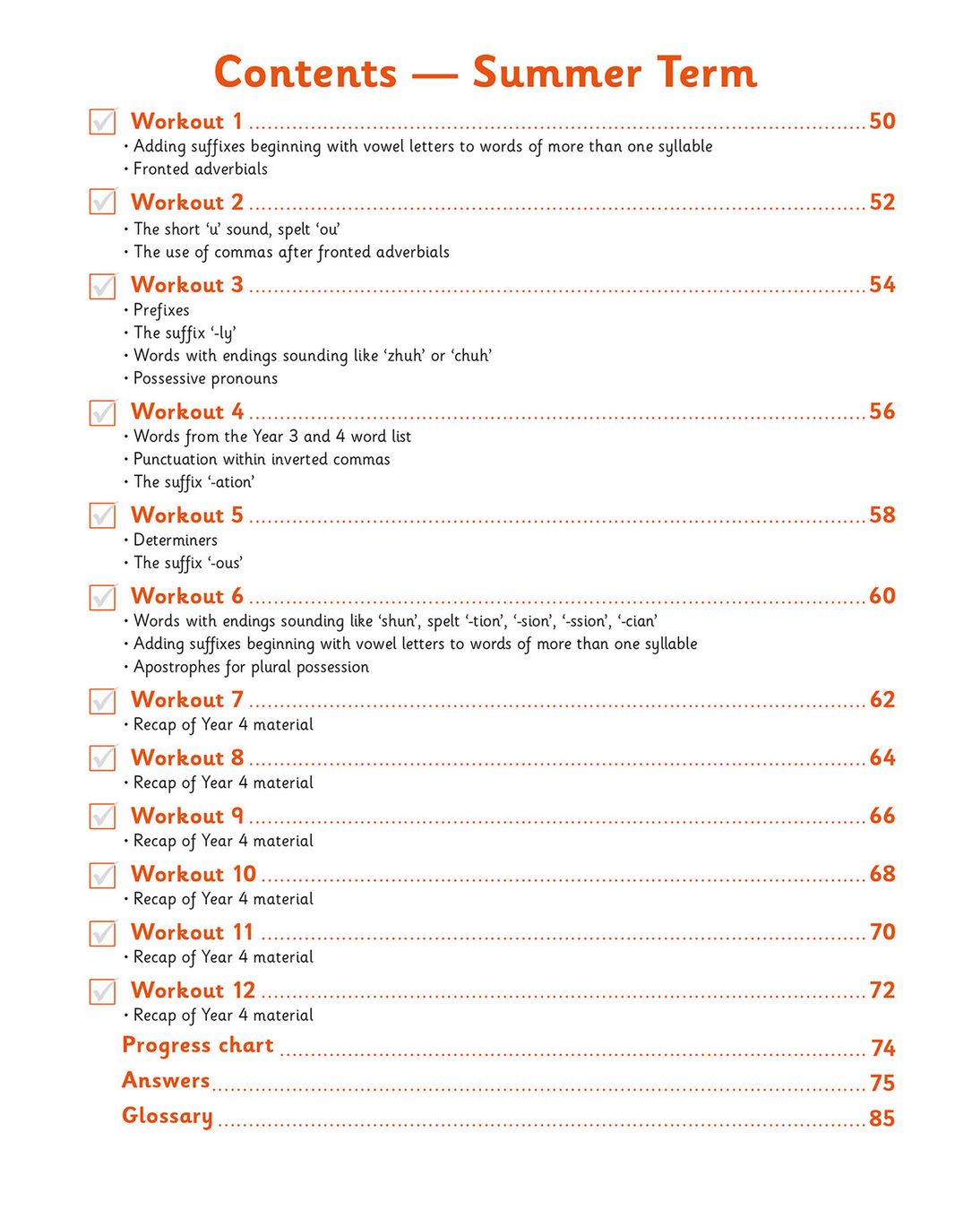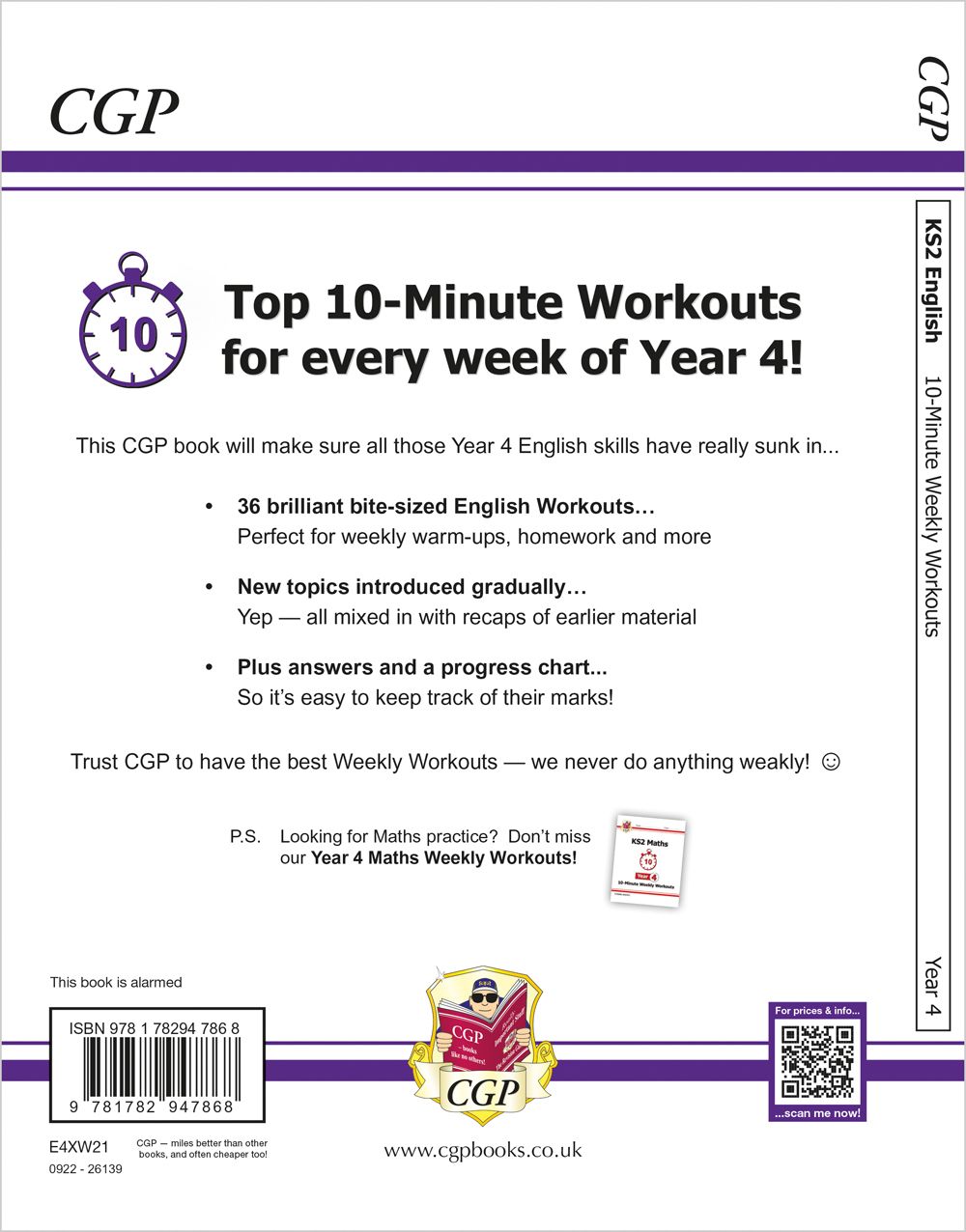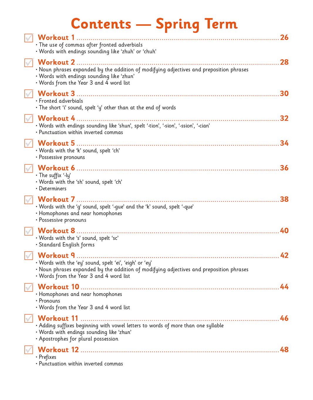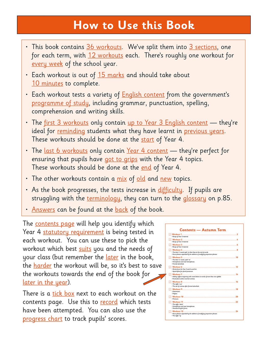 - 36 weekly workouts covering reading comprehension, spelling, punctuation, grammar and writing across the Year 4 curriculum