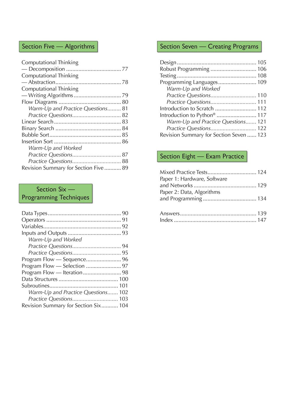 Each section blends concise explanations with warm-up questions and practice tasks, so your child can check understanding as they go. The book includes worked programming examples in both Scratch and Python, making abstract ideas concrete. Practice tests throughout and a full practice exam at the back let your pupil test their recall under realistic conditions, while full answers for every question mean they can self-assess, spot gaps, and revise independently. A free online edition for PC, Mac, or tablet adds flexibility for on-the-go review or screen-based study.