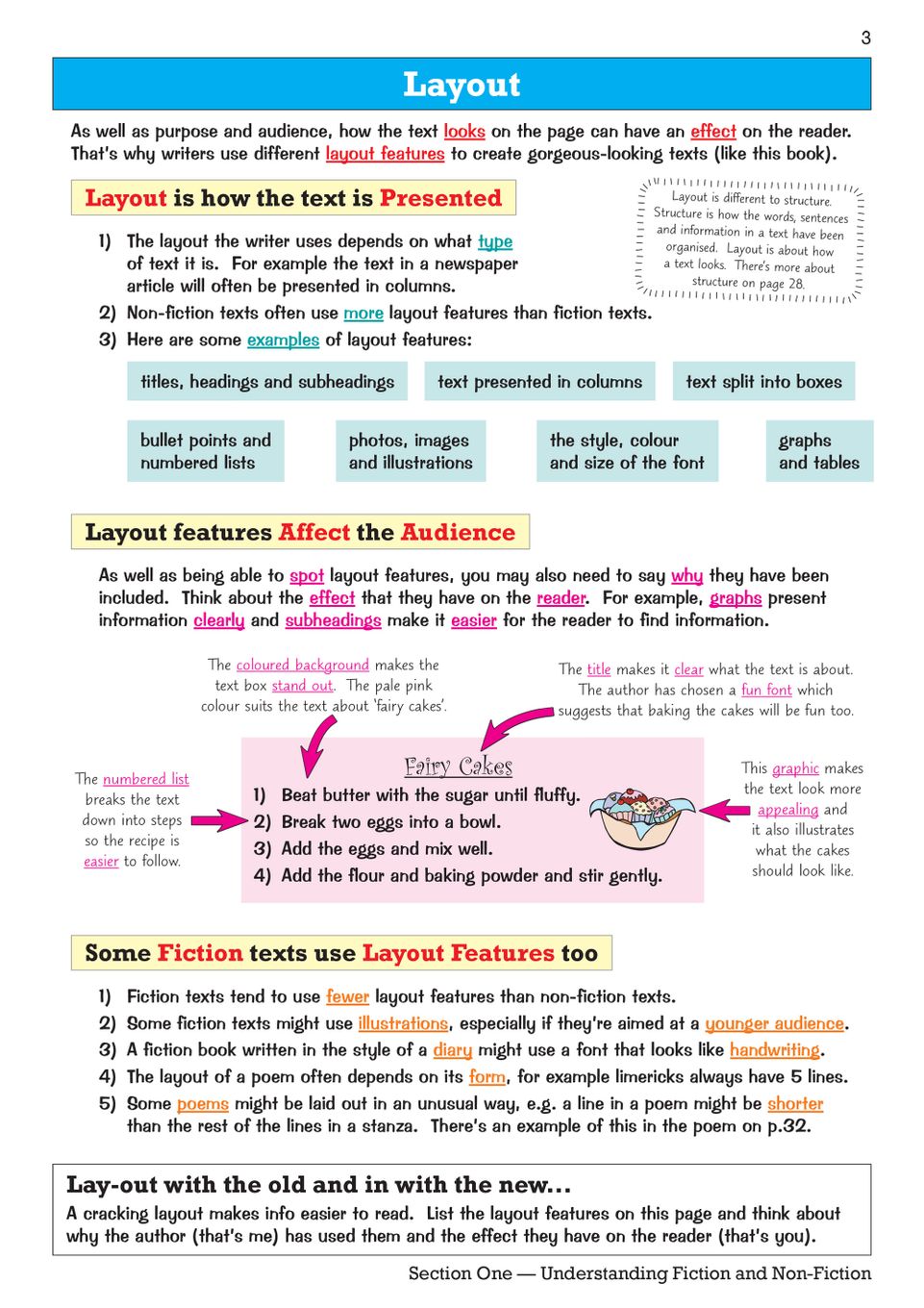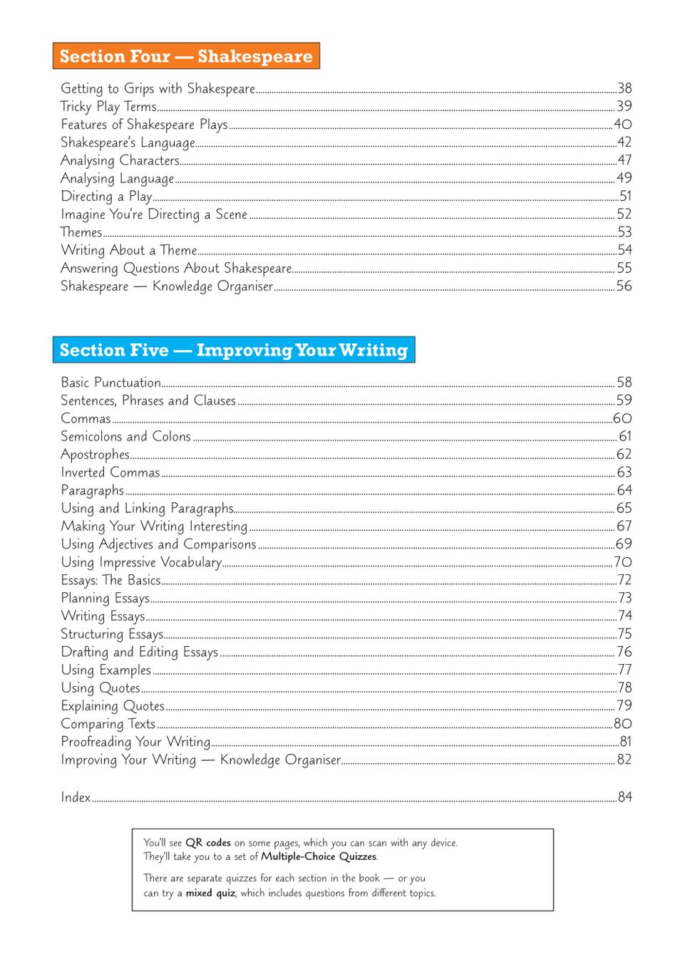 Knowledge organiser pages at the end of every section distil the essentials into one visual summary, perfect for last-minute refreshers or quick self-tests. QR codes scattered throughout unlock topic-by-topic online quizzes, letting your child check understanding on the go, while the free Online Edition means revision continues on any device. For extended practice, the matching KS3 English Workbook pairs seamlessly with this study book. Clear annotations guide pupils through layout features such as titles, bullet points, graphs and font choices, showing how structure affects meaning.