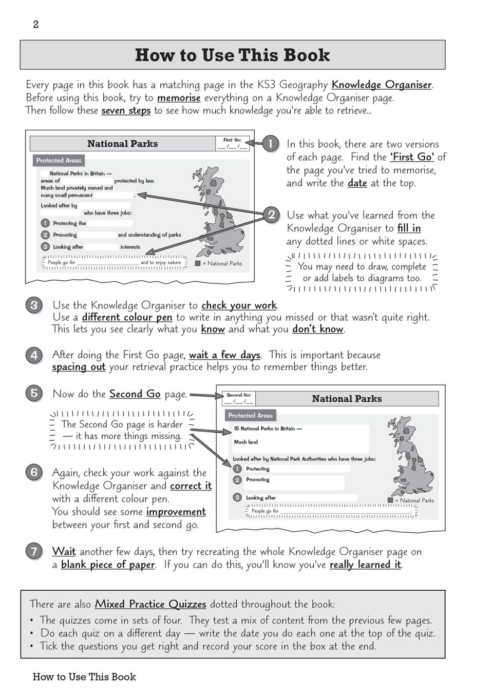 Each topic follows a proven two-step structure: once your child has learned a section in the organiser, they tackle a first round of fill-in-the-blank questions to test recall, then move on to a tougher second test with even more gaps to push their memory further. All answers sit in the back of the Knowledge Organiser for quick self-marking, and when they're ready, mixed-practice quizzes at the end of each theme bring everything together. This straightforward system means you can hand your child the book and trust them to work independently, without endless prompting or confusion over what to revise next.