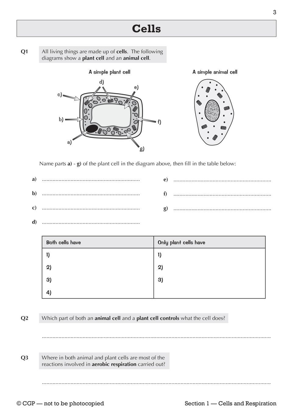 Page showing KS3 Biology workbook cells topic with labelled plant and animal cell diagrams and practice questions