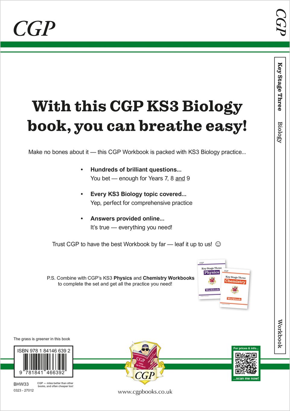 Back cover of CGP KS3 Biology workbook showing hundreds of questions for Years 7 8 and 9 with QR code for online answers