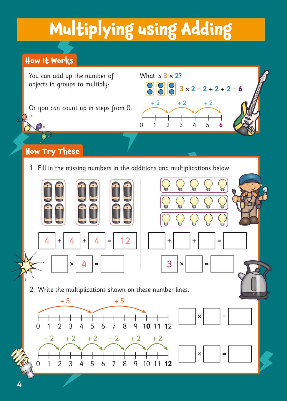 Each page introduces one concept at a time, using pictures and real-world scenarios—torches and batteries, animals in groups—so abstract ideas become concrete. Your child will match additions to multiplications, complete number lines, solve word problems and tackle 'Extra Challenge' puzzles that stretch reasoning without overwhelming. Full answers are included at the back of the book, so you can check work together and quickly address any misunderstandings before they settle.
