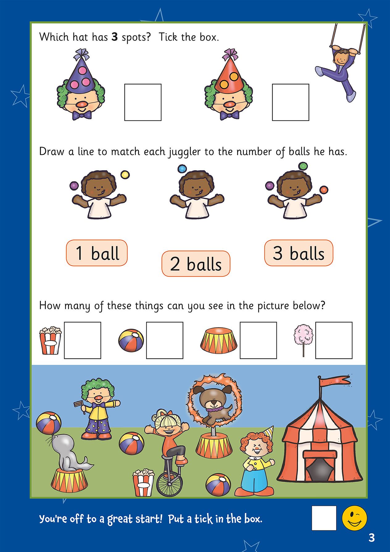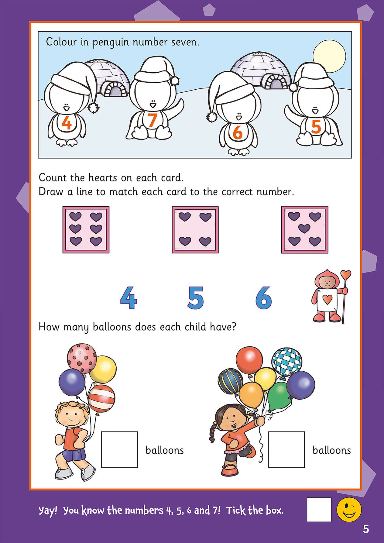 - Colourful illustrations and familiar objects (balloons, apples, stars) make counting engaging
