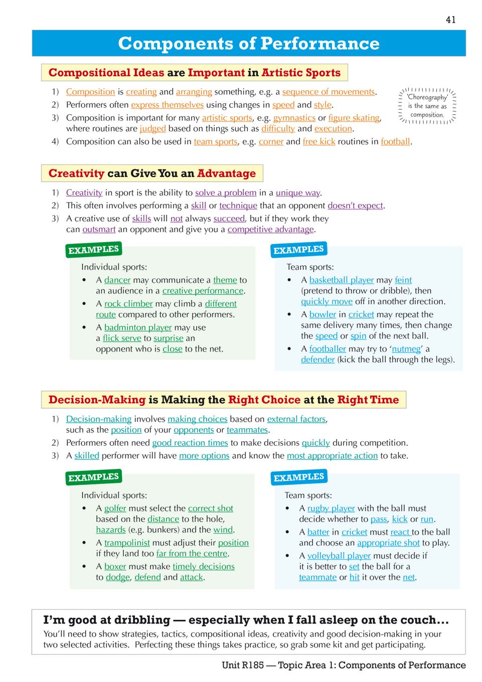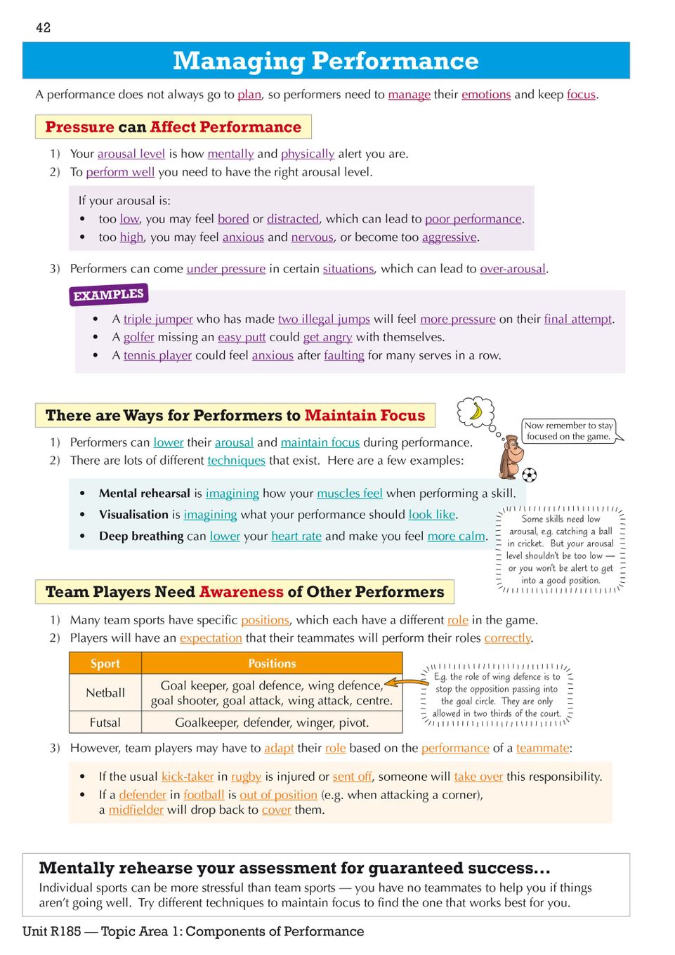 Each unit is laid out so your child can follow the thread from basic concepts—like individual versus team sports and the skills needed—through to higher-level topics such as strategies, tactics and performance components. The guide doesn't just explain what to know; it offers direct advice on how to approach each assignment and prepare for the exam, so your child understands both the content and the task at hand. The free Online Edition mirrors the printed book page for page, letting them revise on a tablet, laptop or desktop wherever suits them best—perfect for fitting study around family life or catching up on the move.