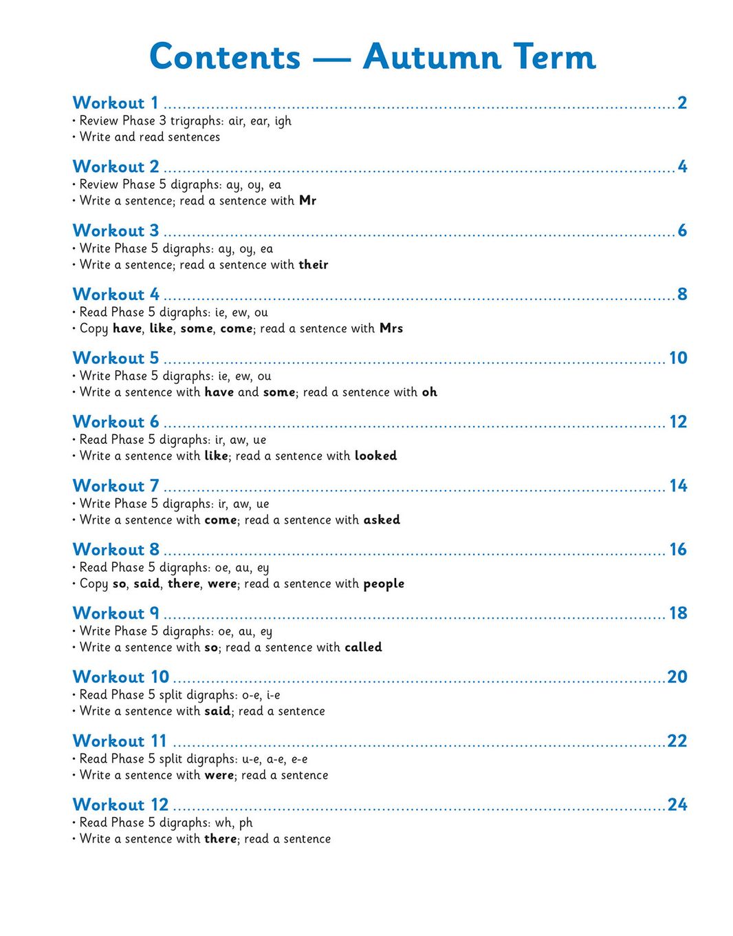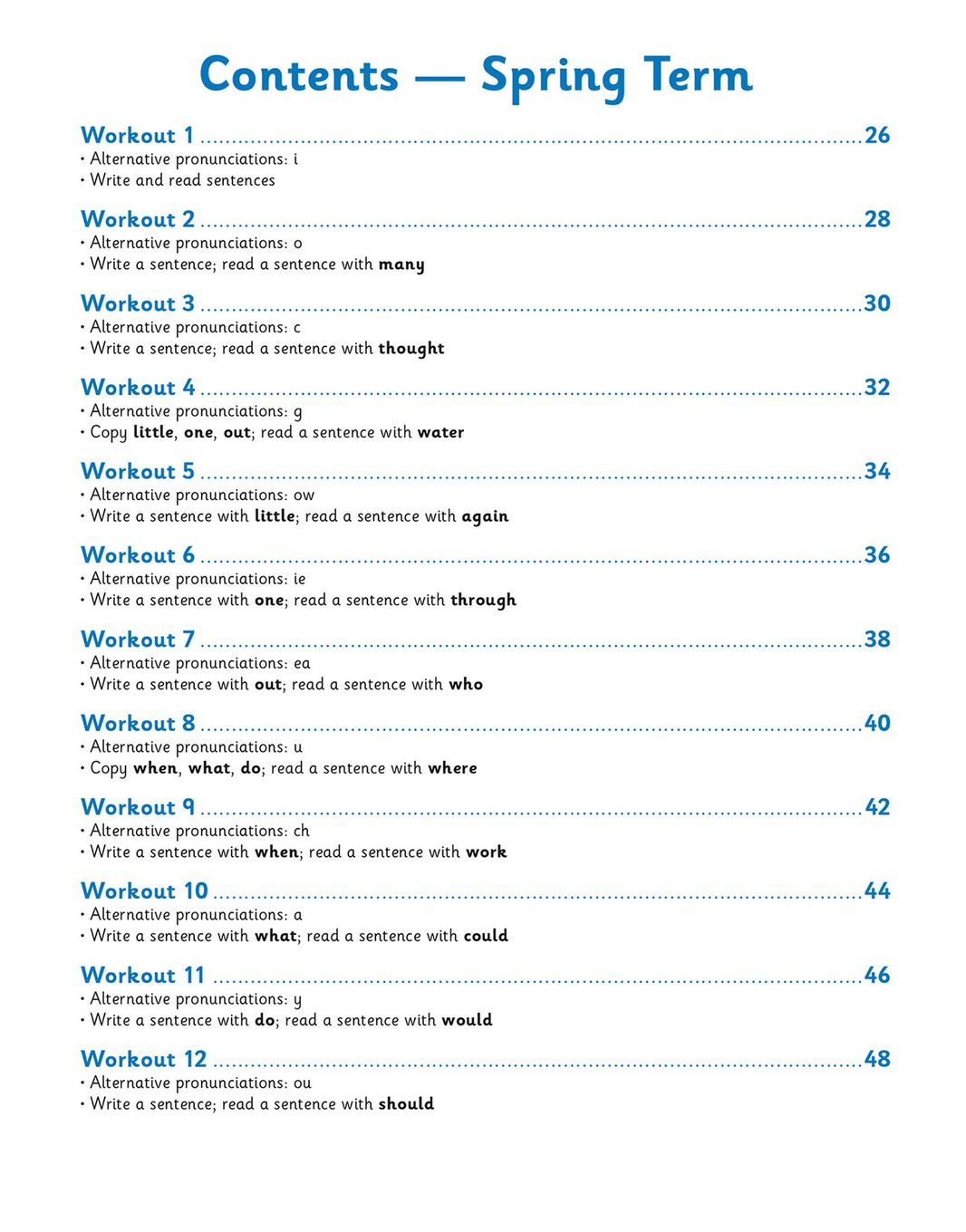 - Twelve weekly 10-minute workouts per term covering alternative spellings, sentence reading and phonics writing tasks