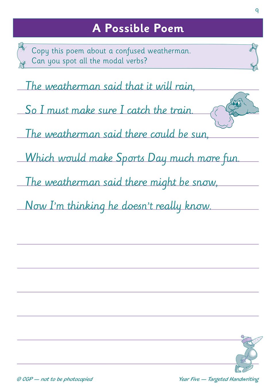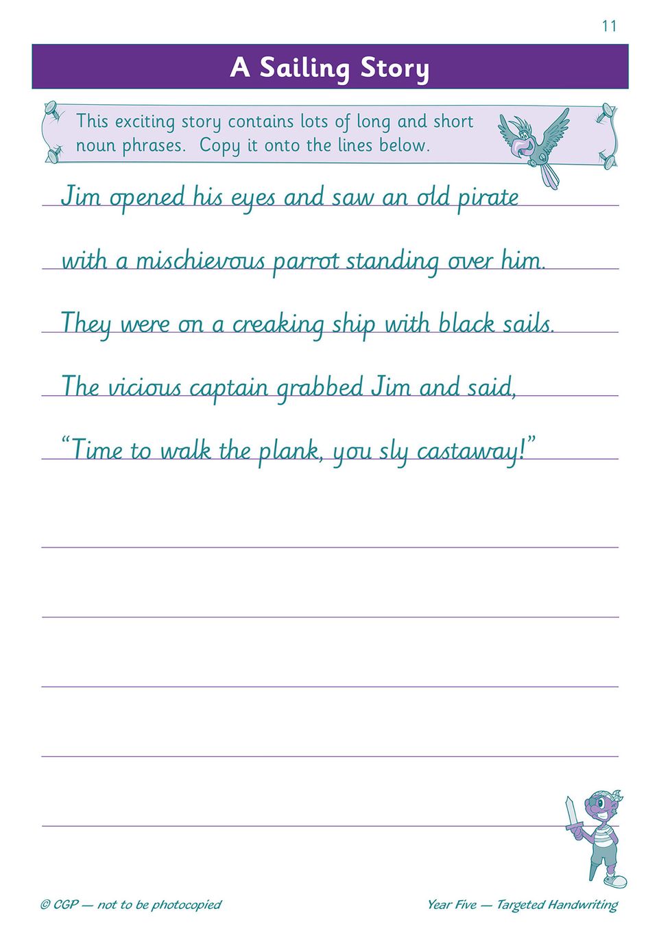 Each activity is designed to feel purposeful rather than repetitive. Your child will copy out noun phrases, modal verbs, instructions and longer narratives — all chosen to keep things interesting while reinforcing the correct letter joins, spacing and flow. Because the workbook covers a variety of text types, your child stays engaged and develops the stamina needed for longer writing tasks in class and in tests. It aligns fully with the English National Curriculum for Year 5, so you know every page supports what they're learning at school.